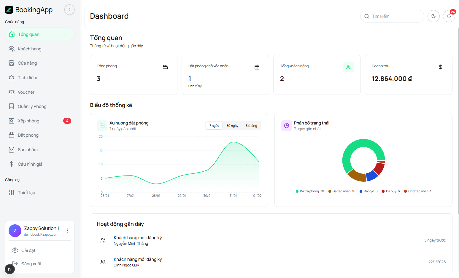 Phần mềm quản lý khách sạn toàn diện với Zalo Mini App tích hợp sẵn. Đặt phòng, quản lý phòng, tích điểm - tất cả trong 1 nền tảng.